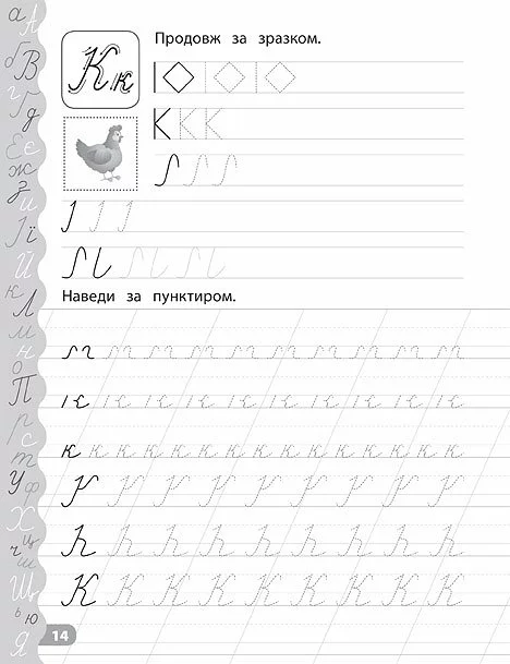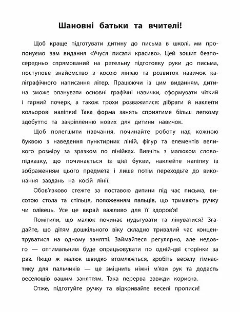 Зошит спрямований на ретельну підготовку руки до письма, поступове знайомство з косою лінією та розвиток навичок каліграфічного написання літер. Працюючи із цим виданням, дитина зможе опанувати основні графічні навички, сформувати чіткий і гарний почерк, а також трохи розважитися: дібрати й наклеїти кольорові наліпки. Прописи призначені для спільної роботи дорослих з дітьми дошкільного віку.