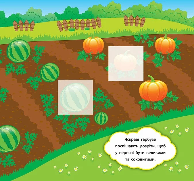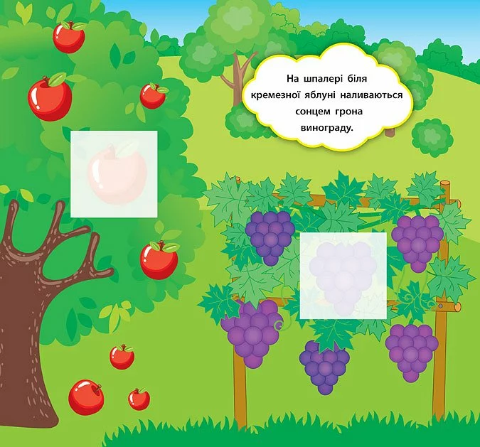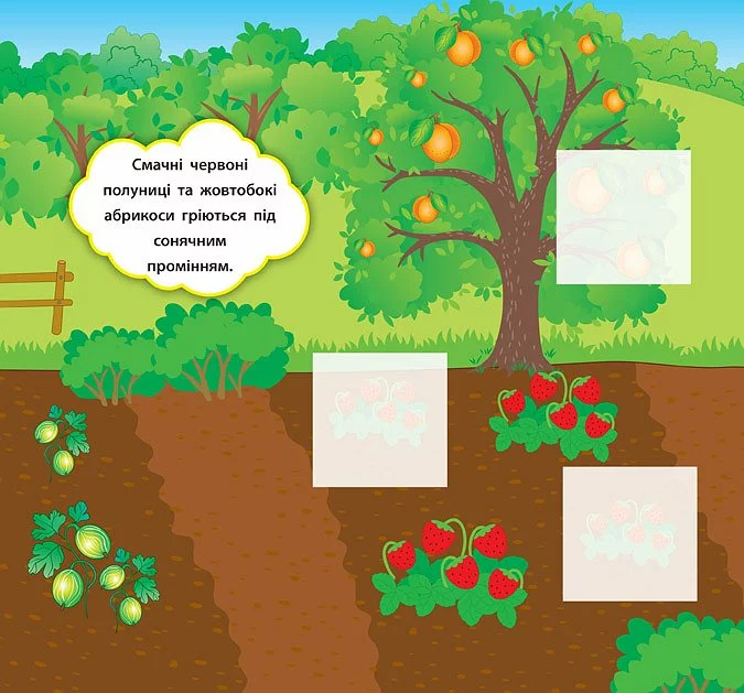 Ця книга познайомить дітей з овочами, фруктами та ягодами. Також видання навчить малюків розрізняти поняття цілого та його частини. За допомогою фрагментів-наліпок дитина зможе доповнювати яскраві картинки, а короткі розповіді на кожній сторінці допоможуть батькам зацікавити малюка й стануть гарним поштовхом до створення власних історій. Книга сприятиме розвитку логічного мислення, фантазії, мовлення, уваги та дрібної моторики пальців рук. Видання призначене для спільної роботи дорослих з дітьми віком від двох років.