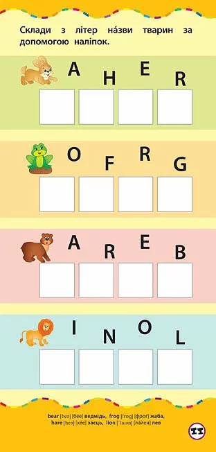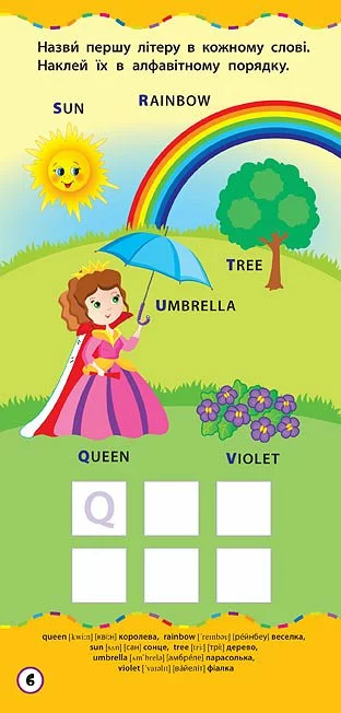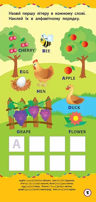 Із цією книгою ваша дитина легко та швидко запам’ятає букви англійського алфавіту, навчиться впізнавати їх у словах, а також потренується утворювати слова за допомогою наліпок. Видання призначене для спільної роботи дорослих з дітьми дошкільного віку.