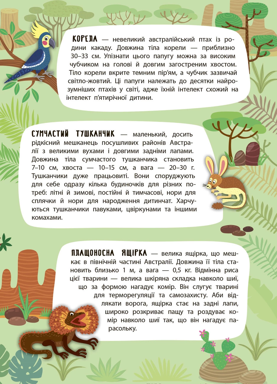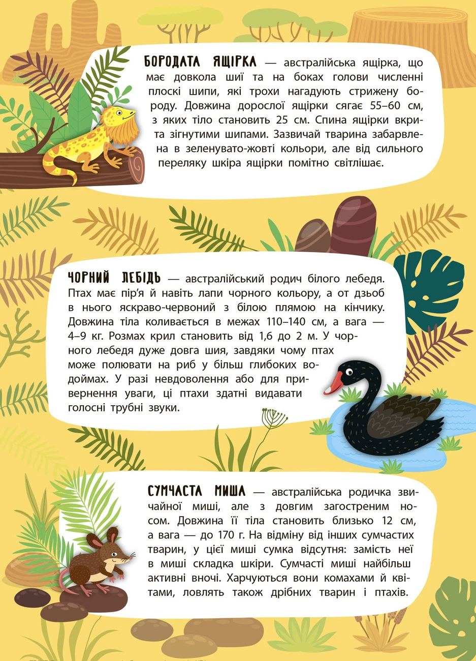 Ця книжка познайомить малюків з тваринним світом Австралії. Видання розширить кругозір дитини, допоможе розвинути творче мислення, фантазію та кмітливість, а також покращить дрібну моторику пальців рук, що сприятиме вдосконаленню мовлення. Велика панорамна ілюстрація, кольорові наліпки та безліч цікавої тематичної інформації гарантують вам захопливе й пізнавальне дозвілля!
