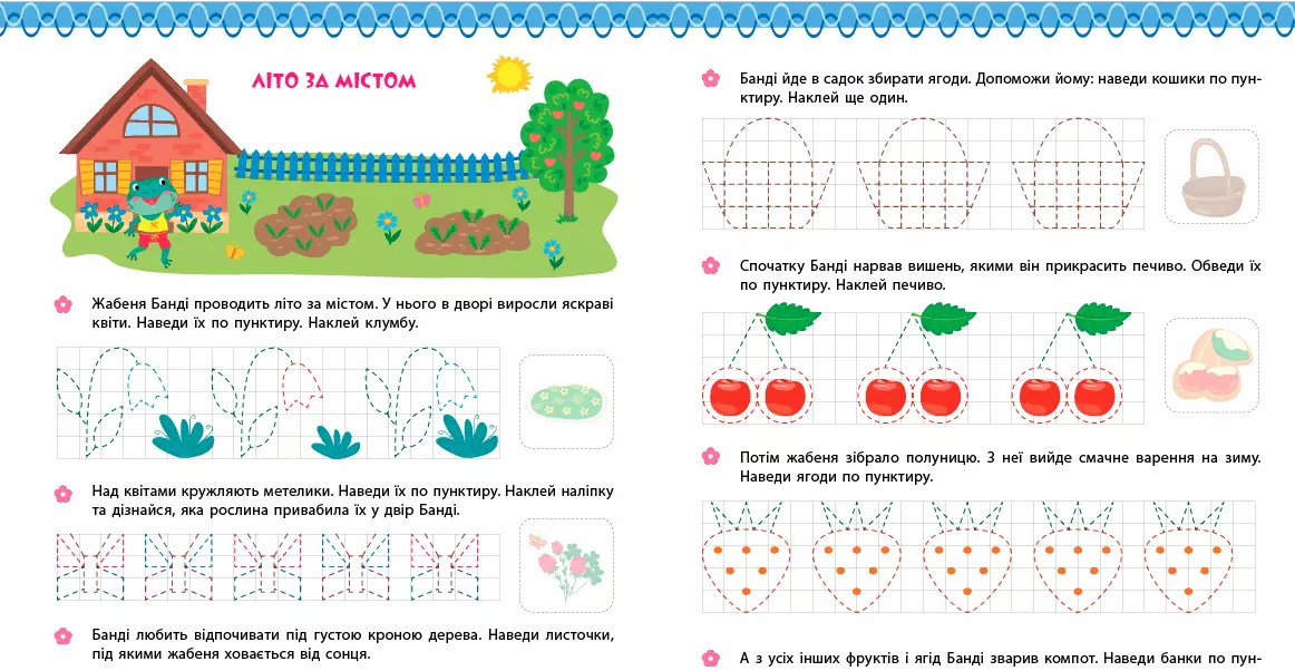 Це видання допоможе дитині швидко й легко пробудити та підтримати інтерес до письма, адже створене з урахуванням психології дитини. Прописи складаються із захопливих історій про пригоди тварин, які потрібно доповнити графічними візерунками, фігурами й наліпками, а також навести по пунктиру та розфарбувати окремі предмети. Таким чином малюк стане активним учасником цікавої гри, захопливих пригод і неймовірних подорожей, а також розвине графічні навички, мислення та мовлення. Видання призначене для спільної роботи дорослих з дітьми від трьох років.