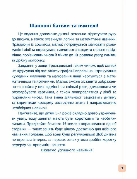 Це видання допоможе дитині ретельно підготувати руку до письма, а також розвинути логічні та математичні навички. Працюючи із зошитом, малюк потренується малювати різноманітні лінії та штрихувати, навчиться знаходити спільне та відмінне, порівнювати числа й лічити до 10, розвине увагу, пам’ять та дрібну моторику. Книга призначена для старших дошкільників та першокласників.