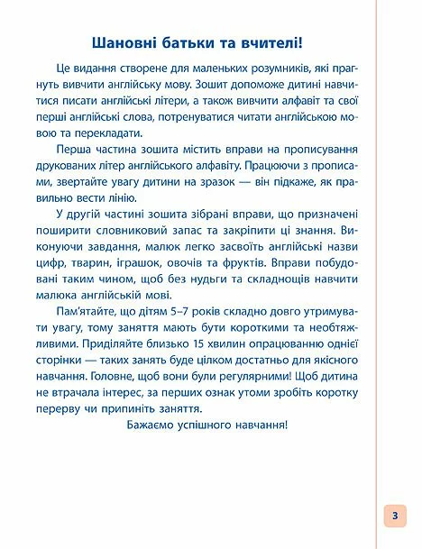 Це видання створене для маленьких розумників, які прагнуть вивчити англійську мову. Зошит допоможе дитині навчитися писати англійські літери, а також вивчити алфавіт та свої перші англійські слова, потренуватися читати англійською мовою та перекладати. Книга призначена для старших дошкільників та першокласників.