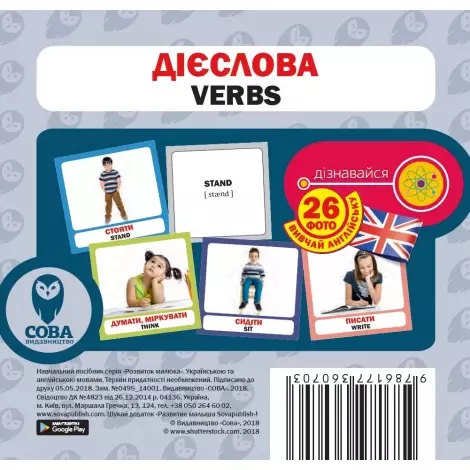 Набір карток Дієслова англо-український карток буде відмінною покупкою для ігор з вашою дитиною і для його розвитку. З серією карток "Готуємось до школи" малюк з легкістю вивчить нові слова, а зокрема, дієслова. У коробці аж 26 карток. На кожній з яких представлені яскраві і цікаві малюнки для візуалізації і кращого запам'ятовування нових дієслова. У формі веселої гри дитина досить швидко зможе освоїти представлений матеріал. Навчання може бути цікавим! Такі картки допоможуть налагодити відносини батьків з дитиною при грі з ними. Вони розвивають у малюка такі якості як: наполегливість, логічне мислення, візуальну пам'ять і характер. Виконано картки з картону який покритий лаком, завдяки чому вони не будуть швидко зношуватися. До того ж вони є гіпоалергенними. Тип іграшки: Картки навчальні. Матеріал: Картон. Картки Домана: Маленькі (10х10см), Англійські, Українські.