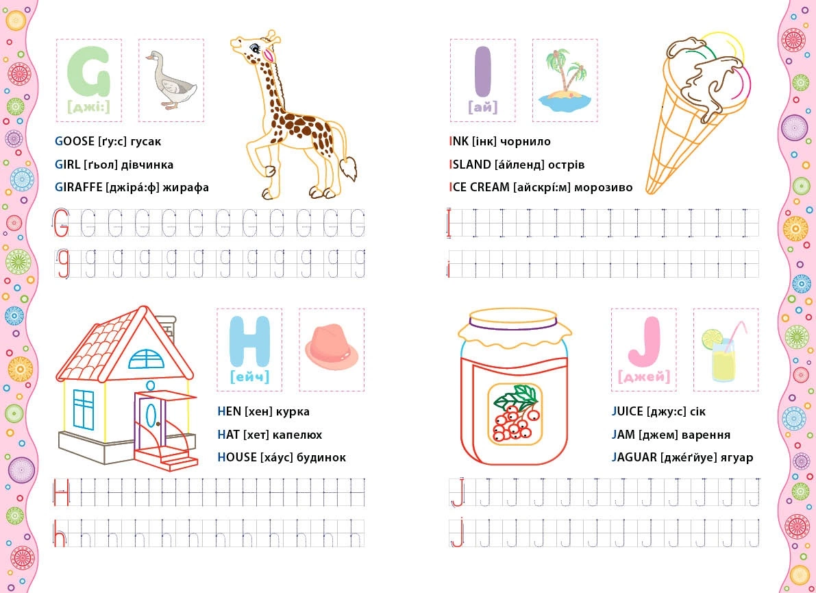 «Прописи-розмальовки. Англійський алфавіт» — це відмінний помічник дитини у вивченні англійської мови, адже видання містить прописи, розмальовки, літери-наліпки та касу букв і буквосполучень. Завдяки цьому виданню дитина познайомиться з буквами англійського алфавіту, навчиться їх писати, запам’ятає їхні назви та графічні образи, почне опановувати навички читання англійською мовою, зможе скласти перші англійські слова та розважитись, розфарбовуючи ілюстрації. Ігри з касою сприятимуть розширенню словникового запасу й розвитку мовлення дитини, а також допоможуть розвинути пам’ять, увагу та дрібну моторику. Бажаємо цікавого навчання та захопливого дозвілля!