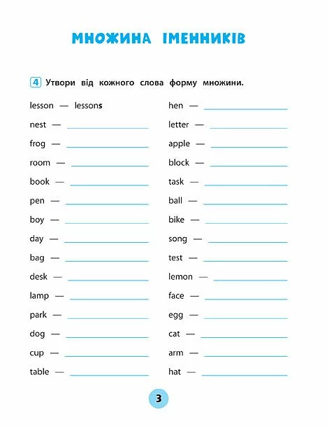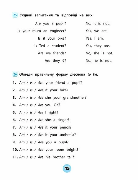 Посібник допоможе учням 2 класу розвинути й удосконалити навички утворення числівників і множини іменників, уживання дієслова «to be» та теперішнього простого часу, а також використання конструкції «have got / has got», займенників, прикметників і прийменників. Перевірити правильність рішення допоможуть ключі, що знаходяться в кінці зошита. Матеріал відповідає освітній програмі з англійської мови для 1–4 класів.