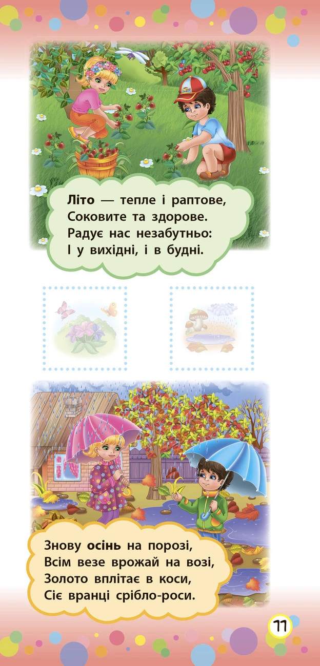Ця книжка у веселій і цікавій формі познайомить ваших дітей з предметами та явищами навколишнього світу. Пізнавальні віршики та яскраві картинки допоможуть малюкам легко й швидко, а головне — із задоволенням вивчити назви меблів, страв, одягу, природних явищ і пір року, а також розвинути зорове сприйняття, уяву та пам’ять. Робота з наліпками неодмінно приверне увагу малюка, урізноманітнить процес навчання та не дозволить нудьгувати. Перетворіть дозвілля дитини на цікаву гру!