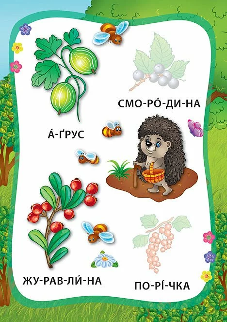 Ця книжка допоможе малюкам навчитися читати по складах і запам’ятати назви овочів та фруктів, розвинути дрібну моторику пальців рук, зорову пам’ять й увагу. Видання містить яскраві ілюстрації, тематичні наліпки й підписи до кожного малюнка. Крім того, слова поділені на склади та надруковані зручними для сприйняття великими літерами. Усе це зробить складний процес читання легким і захопливим.