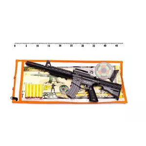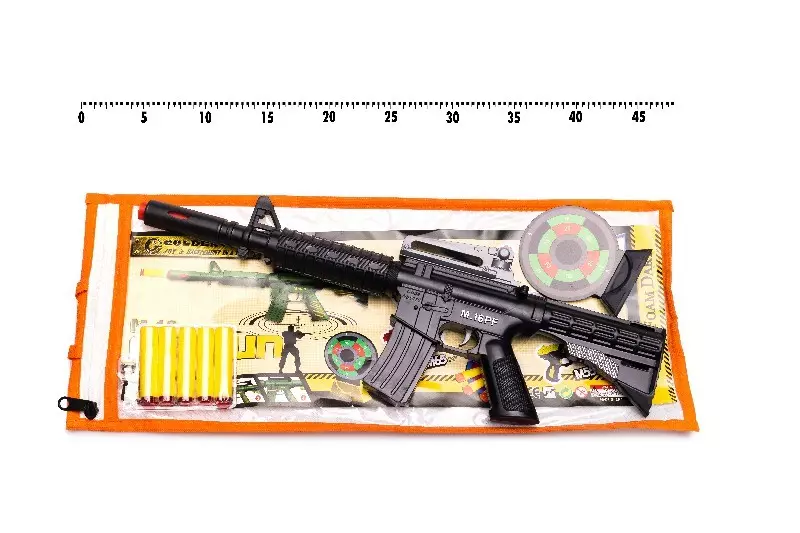 "М16 ПФ" автомат стріля м'якими поролоновими кулями на присосках, довжина - 42 см, висота - 15 см. Комплект: автомат, п'ять м'яких поролонових куль на присосках, мішень кругла на підставці. Упаковка: поліпропіленовий пакет з застібкою. Вага: 190 грам. Артикул: 909