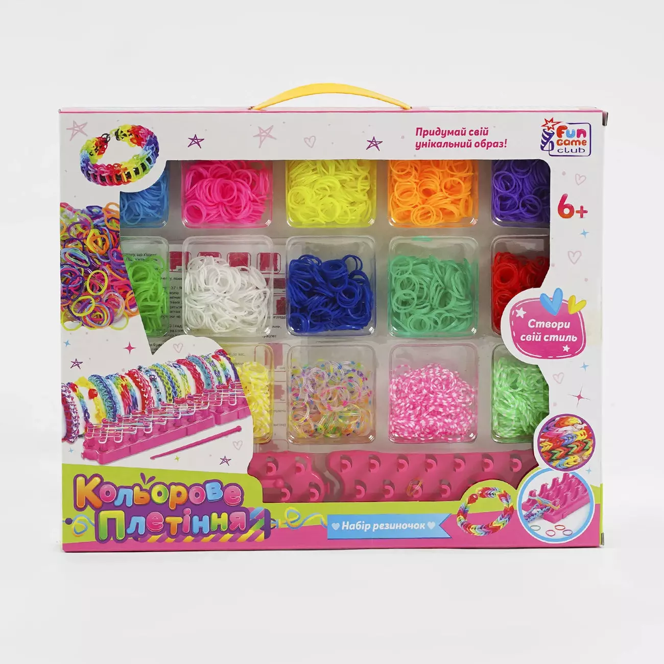 Кольорове плетіння резиночки 95142 (24/2) "4FUN Game Club", 14 кольорів резинок, верстат, гачок, у коробці