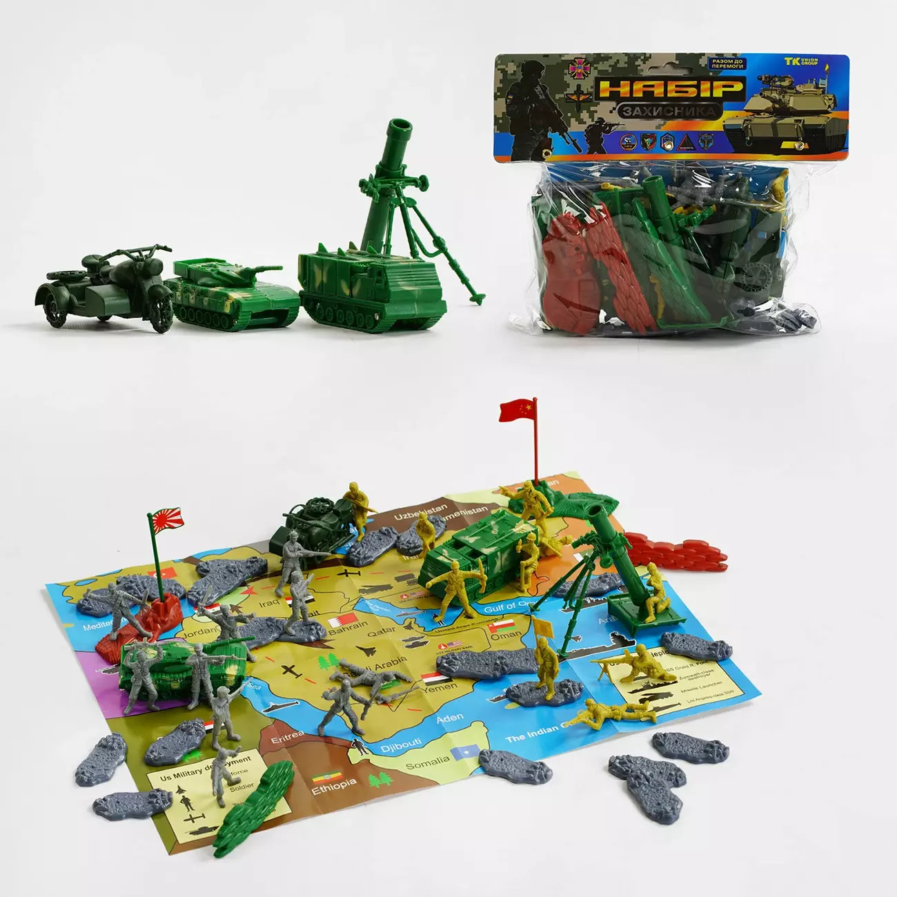 "TK Group" презентує новий ігровий набір маленького захисника. Кожен елемент у ньому виконано з відмінною точністю й увагою до дрібних деталей. Набір містить усе необхідне для повноцінного відтворення запеклої битви: солдатиків, військову техніку, декорації та захисні споруди. Маленький комбат матиме змогу впливати на перебіг подій на полі бою, вміло вибудовуючи тактику і плануючи стратегію. Особливості: - набір включає фігурки солдатів, зброю, військову техніку та захисні споруди; - містить елементи декорацій; - іграшки представлені у різних кольорах, поділяючи солдатів на команди; - тематичний набір виготовлений з якісного та безпечного для здоров’я дитини пластику; - у комплекті представлена карта; - юний комбат зможе втілювати у життя цікаві ігрові сюжети, уявляючи себе захисником, демонструючи свою мужність, хоробрість та сміливість.