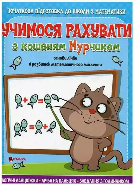 Учимося рахувати з кошеням Мурчиком ТМ Читанка Формат 235*340 мм, 64 сторінки, внутрішній блок-офсет 100 г/м2, обкладинка повнокольорова ламінована крейда 200 г/м2. Вивчаємо цифри, порядок чисел, склад числа, рівності і нерівності, логічні ланцюжки, математичні лабіринти, геометричні фігури, вирішуємо завдання, розвиваємо увагу ... Основи рахування і розвиток математичного мислення. Навчайтеся граючи!