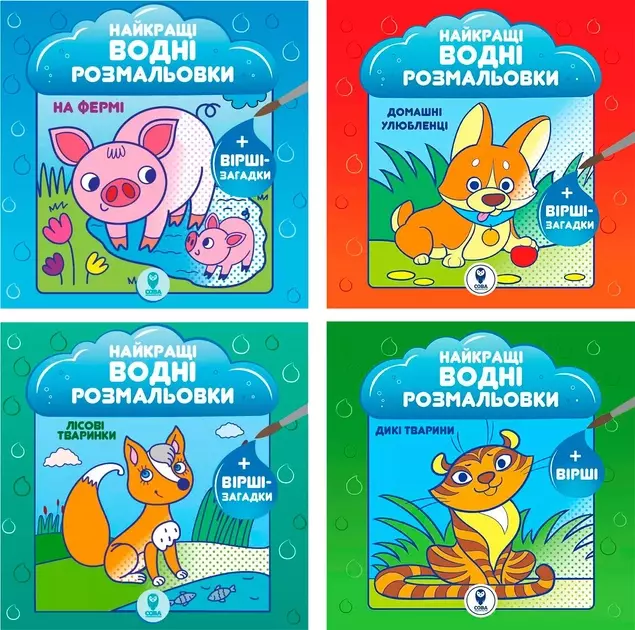 Найкращі водні розмальовки для малюків – чарівні книжечки, що розвивають творчість та увагу. Чудовий набір з 4 водних розмальовок Найкращі водні розмальовки для малюків стане улюбленим заняттям вашої дитини. Ці книжечки дозволять малюку відчути себе справжнім чарівником, адже малюнки проявляються кольором лише після нанесення води. У наборі представлені різноманітні теми: Дикі тварини, Домашні улюбленці, Лісові тваринки та На фермі. Такі популярні сюжети зацікавлять кожну дитину. Наносячи воду пензликом, малюк побачить, як зображення оживають на очах. Процес фарбування абсолютно безпечний та простий. Спеціальний цупкий папір не розмокає, тому дитина може створювати шедеври без хвилювань. Контури малюнків виконані чітко та крупно, щоб полегшити завдання. Кожен малюнок має відступ для вирізання готової роботи. Так сторінки не склеюватимуться та дитина зможе зберігати свої творіння. Окрім задоволення від малювання, водні розмальовки розвивають кмітливість, увагу, моторику малюка. Вірші та цікаві факти про тварин збагачують словниковий запас та розширюють кругозір. Набір Найкращі водні розмальовки для малюків – чудовий спосіб заохотити творчість та пізнання дитини. Кольорові малюнки, що оживають на очах, неодмінно зачарують малечу. Подаруйте дитині можливість відчути себе чарівником! Дозвольте проявити фантазію та креативність! Водні розмальовки сприяють гармонійному розвитку, розширюють кругозір та приносять масу задоволення. Це чудова альтернатива гаджетам та ідеальний вибір для творчої дитини.