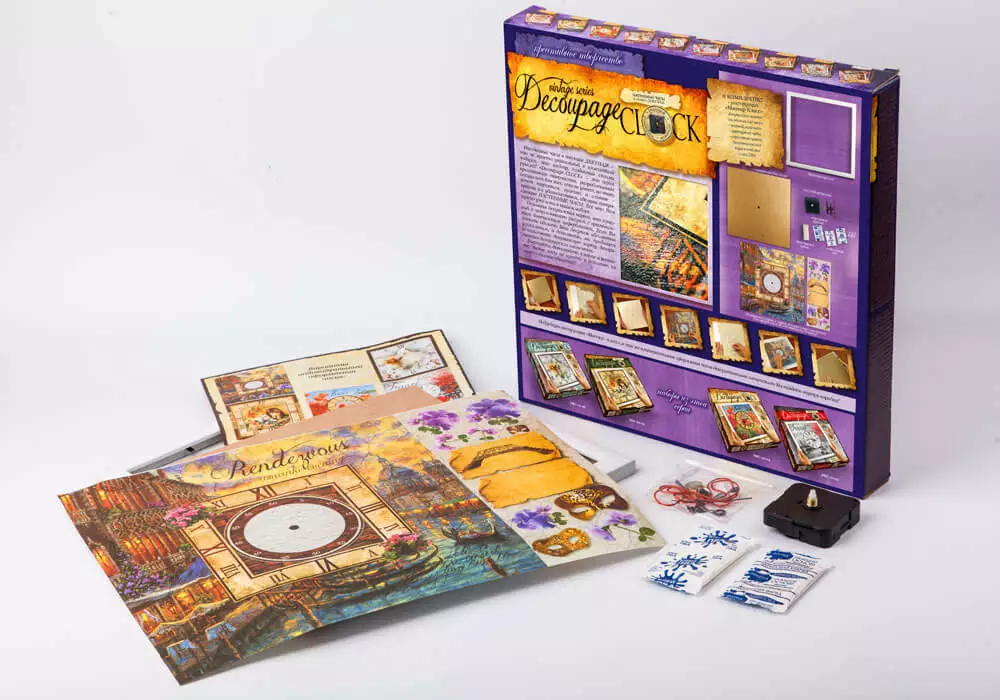 5 видів: Париж, маки, кошенята, Венеція, коні У наборі: - Інструкція; - Декупажні карти; - Заготівка для годин; - Годинниковий механізм; - Фактурна гумка; - Акрилова фарба; - Акриловий лак; - Клей ПВА. Набір для творчості «Годинник Decoupage Clock c рамкою» сподобається як початківцям-рукодільницям, так і досвідченим майстриням своєї справи. Настінні годинники своїми руками, виконані в техніці декупажу, стануть авторським подарунком для близької людини, а також вишуканою прикрасою інтер'єру Вашої квартири, якщо Ви вирішите залишити отриманий шедевр в себе. Докладна інструкція з майстер-класом, а також спеціальна декупажна карта з декоративними елементами дозволить зробити Ваші вінтажний годинник по-справжньому унікальними і неповторними. Інших таких Ви не знайдете ні в одному магазині, адже вони зроблені своїми руками і з любов'ю!