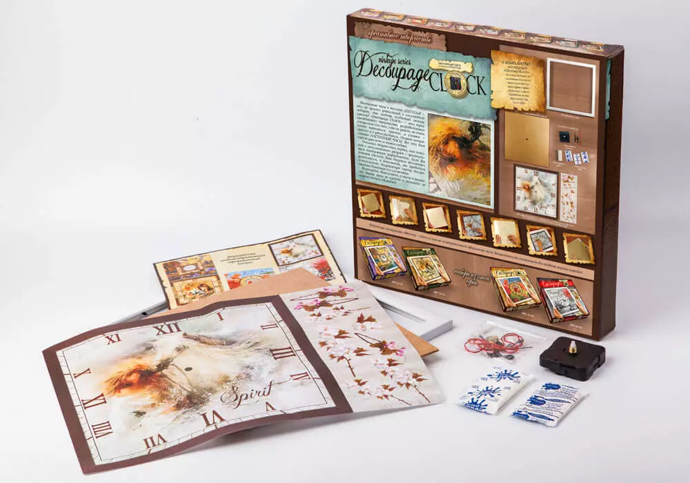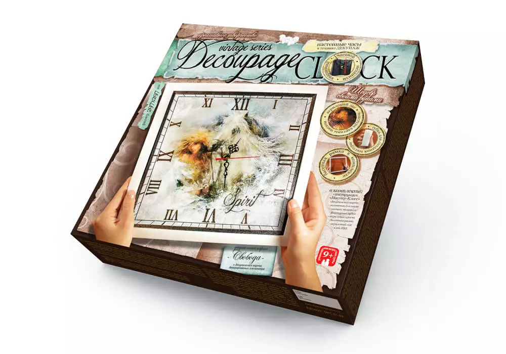 У наборі: - Інструкція; - Декупажні карти; - Заготівка для годин; - Годинниковий механізм; - Фактурна гумка; - Акрилова фарба; - Акриловий лак; - Клей ПВА. Набір для творчості «Годинник Decoupage Clock c рамкою» сподобається як початківцям-рукодільницям, так і досвідченим майстриням своєї справи. Настінні годинники своїми руками, виконані в техніці декупажу, стануть авторським подарунком для близької людини, а також вишуканою прикрасою інтер'єру Вашої квартири, якщо Ви вирішите залишити отриманий шедевр в себе. Докладна інструкція з майстер-класом, а також спеціальна декупажна карта з декоративними елементами дозволить зробити Ваші вінтажний годинник по-справжньому унікальними і неповторними. Інших таких Ви не знайдете ні в одному магазині, адже вони зроблені своїми руками і з любов'ю!