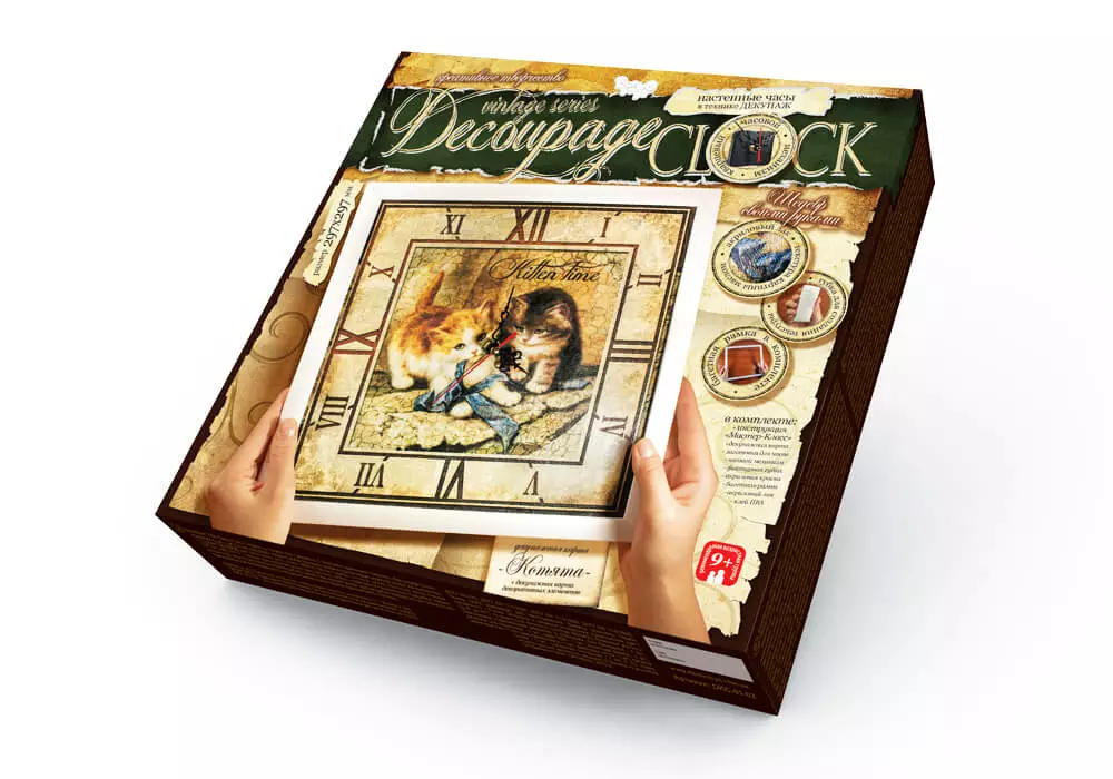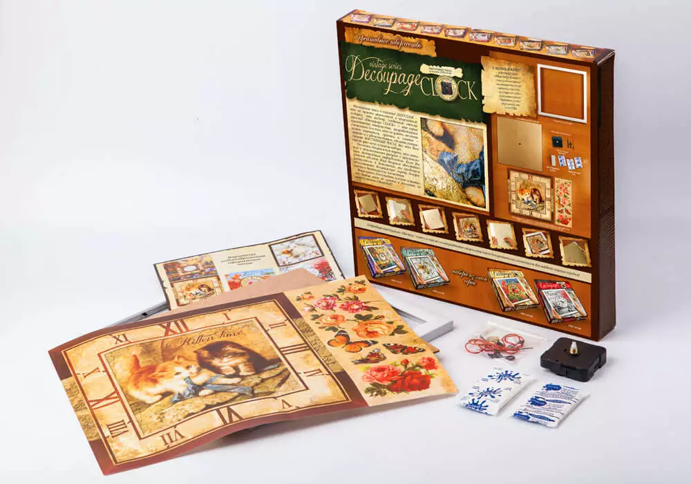 У наборі: - Інструкція; - Декупажні карти; - Заготівка для годин; - Годинниковий механізм; - Фактурна гумка; - Акрилова фарба; - Акриловий лак; - Клей ПВА. Набір для творчості «Годинник Decoupage Clock c рамкою» сподобається як початківцям-рукодільницям, так і досвідченим майстриням своєї справи. Настінні годинники своїми руками, виконані в техніці декупажу, стануть авторським подарунком для близької людини, а також вишуканою прикрасою інтер'єру Вашої квартири, якщо Ви вирішите залишити отриманий шедевр в себе. Докладна інструкція з майстер-класом, а також спеціальна декупажна карта з декоративними елементами дозволить зробити Ваші вінтажний годинник по-справжньому унікальними і неповторними. Інших таких Ви не знайдете ні в одному магазині, адже вони зроблені своїми руками і з любов'ю!