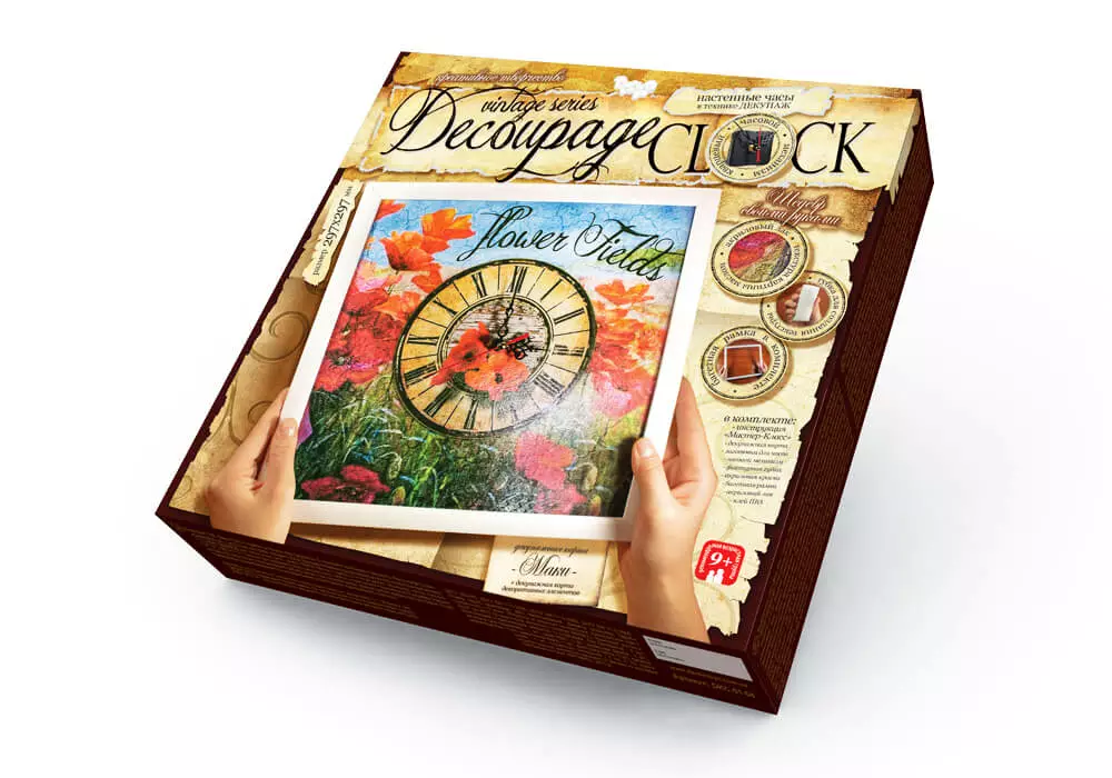 У наборі: - Інструкція; - Декупажні карти; - Заготівка для годин; - Годинниковий механізм; - Фактурна гумка; - Акрилова фарба; - Акриловий лак; - Клей ПВА. Набір для творчості «Годинник Decoupage Clock c рамкою» сподобається як початківцям-рукодільницям, так і досвідченим майстриням своєї справи. Настінні годинники своїми руками, виконані в техніці декупажу, стануть авторським подарунком для близької людини, а також вишуканою прикрасою інтер'єру Вашої квартири, якщо Ви вирішите залишити отриманий шедевр в себе. Докладна інструкція з майстер-класом, а також спеціальна декупажна карта з декоративними елементами дозволить зробити Ваші вінтажний годинник по-справжньому унікальними і неповторними. Інших таких Ви не знайдете ні в одному магазині, адже вони зроблені своїми руками і з любов'ю!