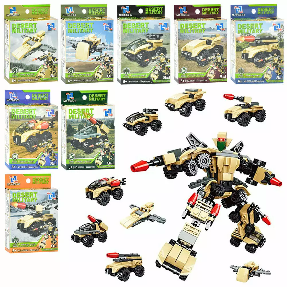 Конструктор 0868-63 військова техніка, від 34 до 22 дет., 8в1, 8 видів, кор., 13,5-9,5-2,5 см.