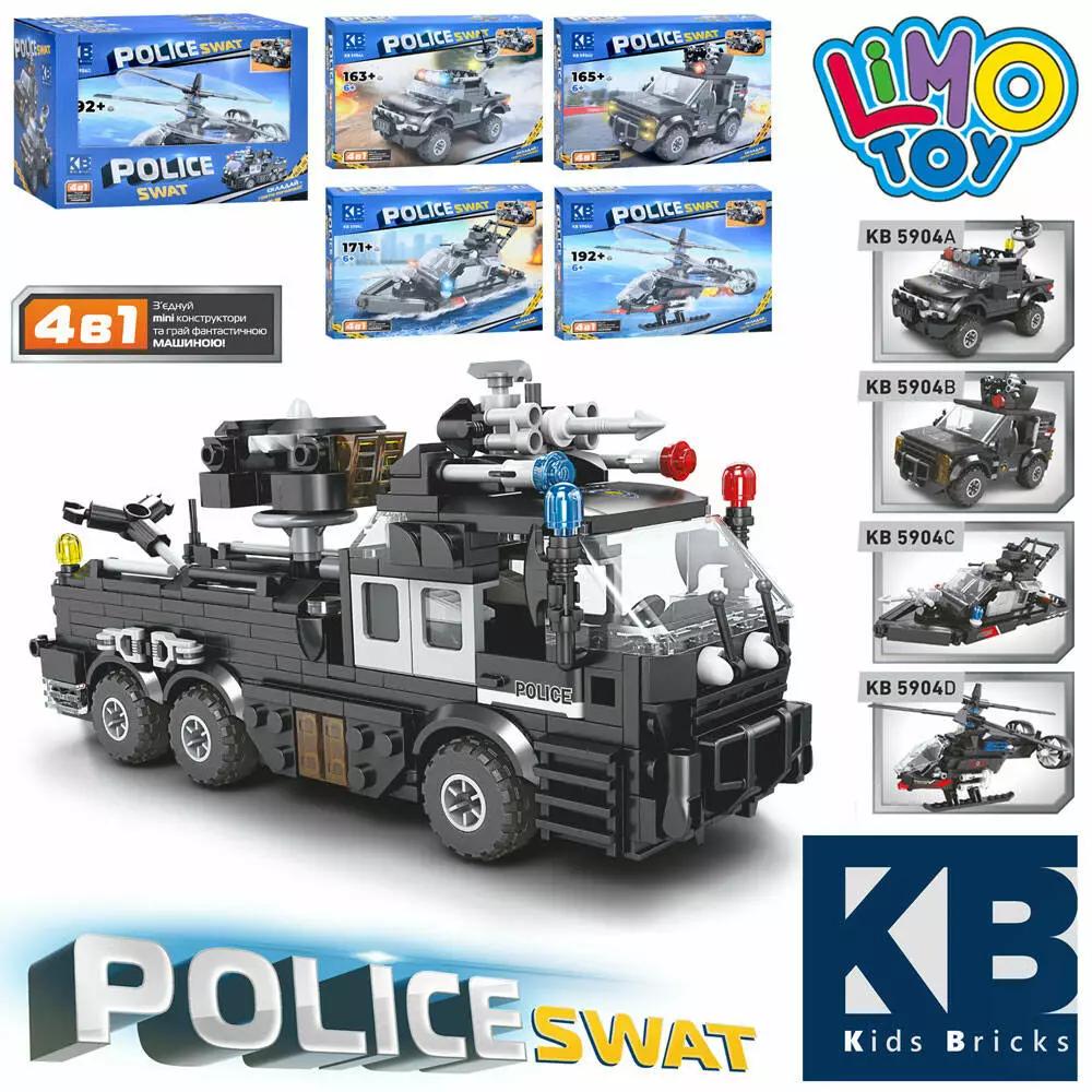 Конструктор KB 5904 поліція, транспорт, від 163 дет.,кор.,4 в1,4 шт.(4 види) в диспл.,32,5-22,5-2см.