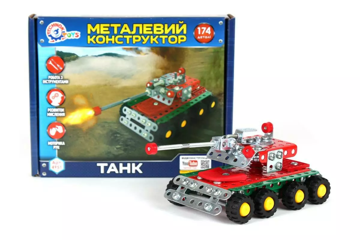 Традиція металевих конструкторів бере свій початок далекому 18 ст. На ЦИХ конструкторах виросло багато поколінь відомих винахідників, механіків і інженерів. Завдяки цій іграшці хлопчаки (і дівчата) отримують перші навички з'єднання деталей гвинтами і гайками, розвивають фантазію і просторову уяву. Для захоплених любителів військових мініатюр, справжніх чоловіків і захисників ми рекомендуємо модель «Танк». Звертаємо увагу на те, що модель має on-line підтримку на YouTube каналі. Крім танка з цього великого набору деталей юний інженер зможе зібрати і інші модельки, які підкаже йому фантазія.