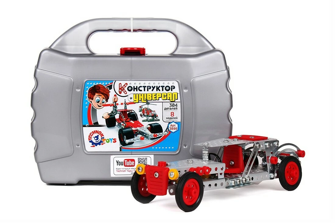 Конструктор "Універсал ТехноК" - металевий конструктор нового покоління. Особливість іграшки - відеоролики з інструкціями для збирання моделей. На упаковці конструктора розміщений QR-код та адреса каналу TechnoKToys на сервісі відеохостингу YouTube. До прикладу, Ви починаєте збирати модель "Джип" чи кран з набору. Звичайно можна скористатися кольоровою інструкцією з комплекту, проте значно наглядним і цікавим буде перегляд відеоряду покрокового збирання іграшки від початку до кінця, маючи змогу зупинити відтворення в будь-який момент. Для цього Вам потрібно: просканувати QR-код згаданий вище та вибрати на каналі TechnoKToys відеосервісу YouTube ролик для відповідної моделі - в нашому випадку арт. 3886. Конструктор пакується в пластикову валізу кольору сріблястий металік з защіпкою.
