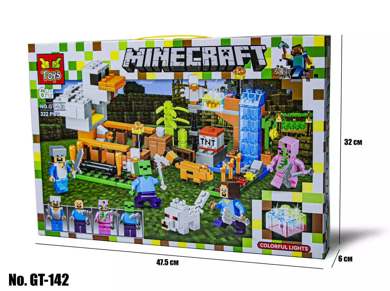 <p><em><strong>Конструктор Minecraft</strong></em> <em><strong>Gt-142</strong></em></p><br /> <p>Игровой набор состоит из 322 деталей, минифигурки в комплекте.</p><br /> <p>Конструкторы Майнкрафт - это замечательный выбор и для подарка геймеру, и для развития ребенка. Возможность воссоздавать неповторимый игровой мир, не прибегая к использованию компьютера, позволяет развить воображение ребенка, а также стимулирует развитие мелкой моторики. Процесс строительства из красочных блоков конструктора очень интересен, у ребенка появляется возможность для творчества. Также это развивает логическое мышление, учит его сосредотачиваться и концентрироваться на поставленной задаче. Для детей и взрослых станет отличным способом совместного времяпрепровождения, ведь собирать конструктор вместе - это очень интересно. Все детали конструктора отлично сочетаются между собой, а также прекрасно крепятся к конструкторам других марок.</p><br />