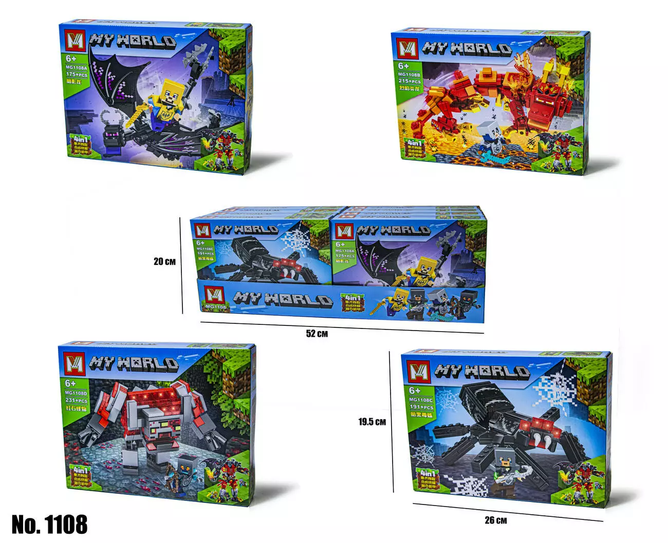 <p><em><strong>Конструктор Minecraft MG1108 4 Вида</strong></em></p><br /> <p><strong>Цена за 1 Вид</strong></p><br /> <p>Конструктор Minecraft 4 Вида – это аналог известного производителя, созданный для поклонников одной из самых успешных компьютерных игр в истории – «Майнкрафт».</p><br /> <p>Серия конструкторов Minecraft по известной всем, без исключения легендарной игре. Больше десяти лет назад игру официально выпустили и практически сразу она завоевала огромную аудиторию поклонников от маленьких до взрослых. Основной особенностью игры является полностью редактируемый трехмерный мир, который состоит из блоков. </p><br /> <p>Тематический конструктор позволит ребенку воссоздать локации из популярной игры прямо у себя дома.Каждый вид включает в себя качественные детали и героя из известной локации , которые хорошо и надежно крепятся между собой.Приобретая все виды конструктора, ребенок сможет сложить целый сюжет.</p><br /> <p>Возможность воссоздавать неповторимый игровой мир, не прибегая к использованию компьютера, позволяет развить воображение у ребенка, а также стимулирует развитие мелкой моторики. Процесс строительства из красочных блоков конструктора очень увлекательный, у ребенка появляется возможность для творчества. Также это развивает логическое мышление, учит его сосредотачиваться и концентрироваться на поставленной задаче. Для детей и взрослых станет отличным способом совместного времяпровождения, ведь собирать конструктор вместе – это очень интересно. Все детали конструктора отлично совмещаются между собой, а так же прекрасно крепятся к конструкторам других марок. </p><br />