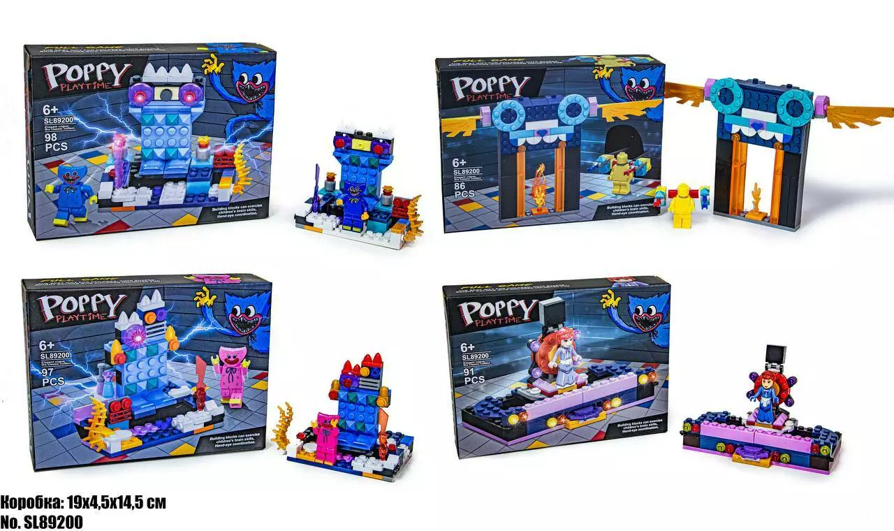<p>Конструктор 89200 Poppy playtime 4 вида</p><br /> <p><strong>Цена за 1 вид :</strong></p><br /> <ul><br /> <li>Хагги Вагги - 98 деталей.</li><br /> <li>Кисси Мисси - 97 деталей</li><br /> <li>Игрок - 86 деталей</li><br /> <li>Кукла Поппи - 91 деталь</li><br /> </ul><br /> <p>Конструктор по сюжету знаменитой компьютерной игры Poppy Playtime Huggy Wuggy (Хагги Вагги) и Kissy Missy (Кисси Мисси). Он непременно приведет в восторг юного поклонника игры, и обеспечит много часов увлекательных занятий.</p><br /> <p>Четыре вида, каждый из которых содержит одного персонажа игры, и блоки, из которых выстраивается обстановка, присутствующая в игре.</p><br /> <ul><br /> </ul><br /> <p>Собранные вместе, все 4 конструктора соединяются между собой и образуют одну большую локацию из игры. У фигурок двигаются руки и ноги. Все детали качественные, прочные, хорошо крепятся между собой.</p><br />