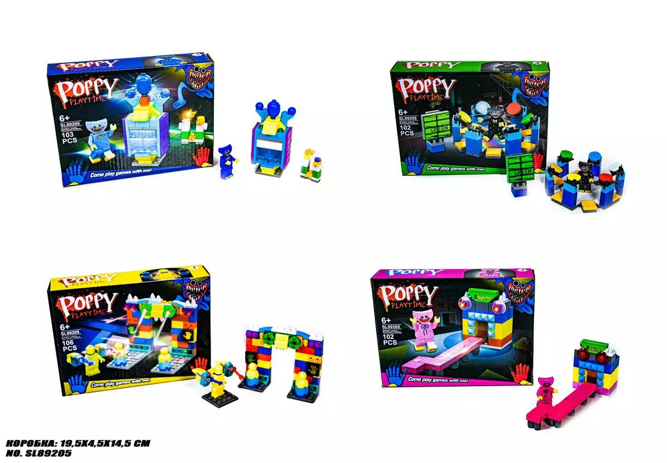 <p>Конструктор 89205 Poppy playtime 4 вида</p><br /> <p><strong>Цена за 1 вид :</strong></p><br /> <ul><br /> <li>Хагги Вагги - 103 детали, состоит из фигурки синего Хаги Ваги, и строительных блоков, из которых собирается обстановка присутствующая в игре.</li><br /> <li>Кисси Мисси - 102 детали, розовый зубастый монстрик Кисси Мисси (Kissy Missy), очаровательная подружка Хаги Ваги.</li><br /> <li>Игрок - 106 детали, главный герой этой модели конструктора - персонаж, управляемый игроком. Он в точности повторяет внешний вид персонажа из компьютерной игры.</li><br /> <li>Килли Вилли - 102 детали, во втором эпизоде игры появляется много разноцветных копий Хаги Ваги. У каждого из них есть свое имя. Черный носит имя Килли Вилли (Killy Willy).</li><br /> </ul><br /> <p>Конструктор по сюжету знаменитой компьютерной игры Poppy Playtime Huggy Wuggy (Хагги Вагги) и Kissy Missy (Кисси Мисси). Он непременно приведет в восторг юного поклонника игры, и обеспечит много часов увлекательных занятий.</p><br /> <ul><br /> </ul><br /> <p>Собранные вместе, все 4 конструктора соединяются между собой и образуют одну большую локацию из игры. У фигурок двигаются руки и ноги. Все детали качественные, прочные, хорошо крепятся между собой.</p><br />