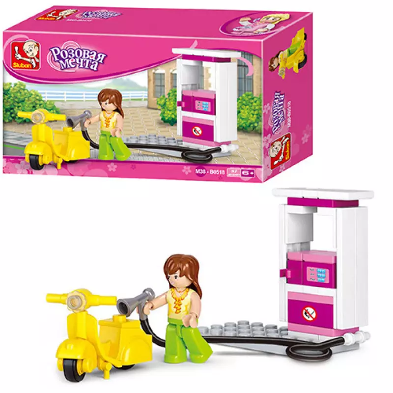 Конструктор SLUBAN M38-B0518 "Рожева мрія": заправка, фігурка, моторолер, 37 дет.16,5-9,5-4,5см