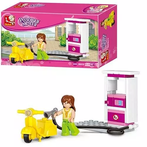 Конструктор SLUBAN M38-B0518 "Рожева мрія": заправка, фігурка, моторолер, 37 дет.16,5-9,5-4,5см