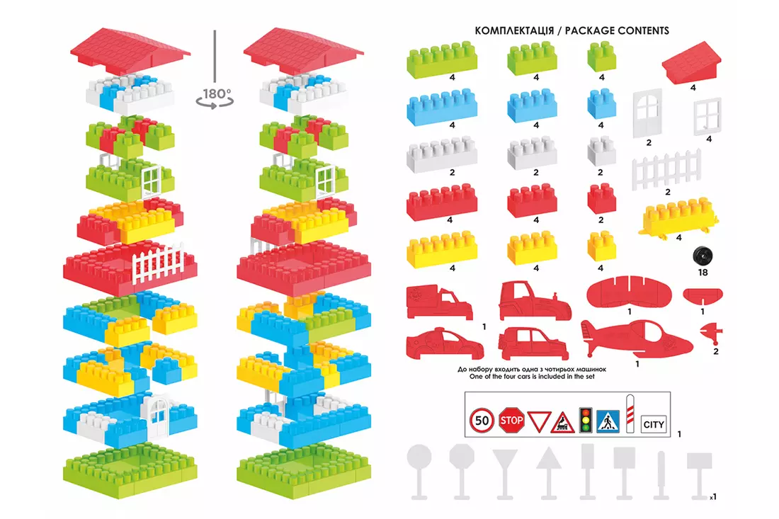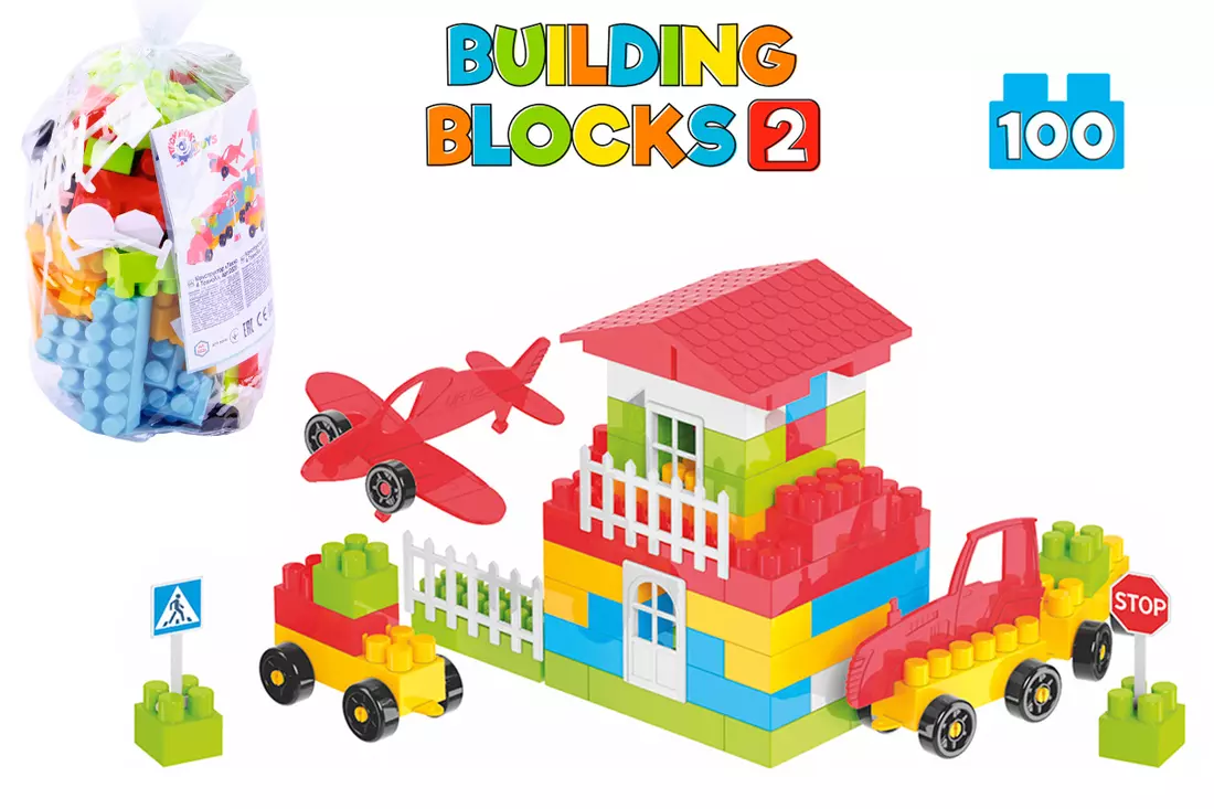 Вага 600 г Габаритні розміри 16?16?32 см Якщо Ви шукайте іграшку, яка прекрасно тренує дрібну моторику, координацію рухів і уяву Вашого малюка, то Ви потрапили на саме таку іграшку. Конструктор 100 елементів не тільки займе дитину на тривалий час, але і розвине основні навички. Крім стандартних блоків конструктор має унікальні фігури, наприклад колеса, фігурки літака, дорожні знаки і багато іншого. Набір складається з великих різнокольорових деталей, тому він зможе підійти для діточок від трьох років. За допомогою блоків малюк зможе побудувати різні будиночки та інші будівлі, тому що в комплекті є набір вікон і дверей.
