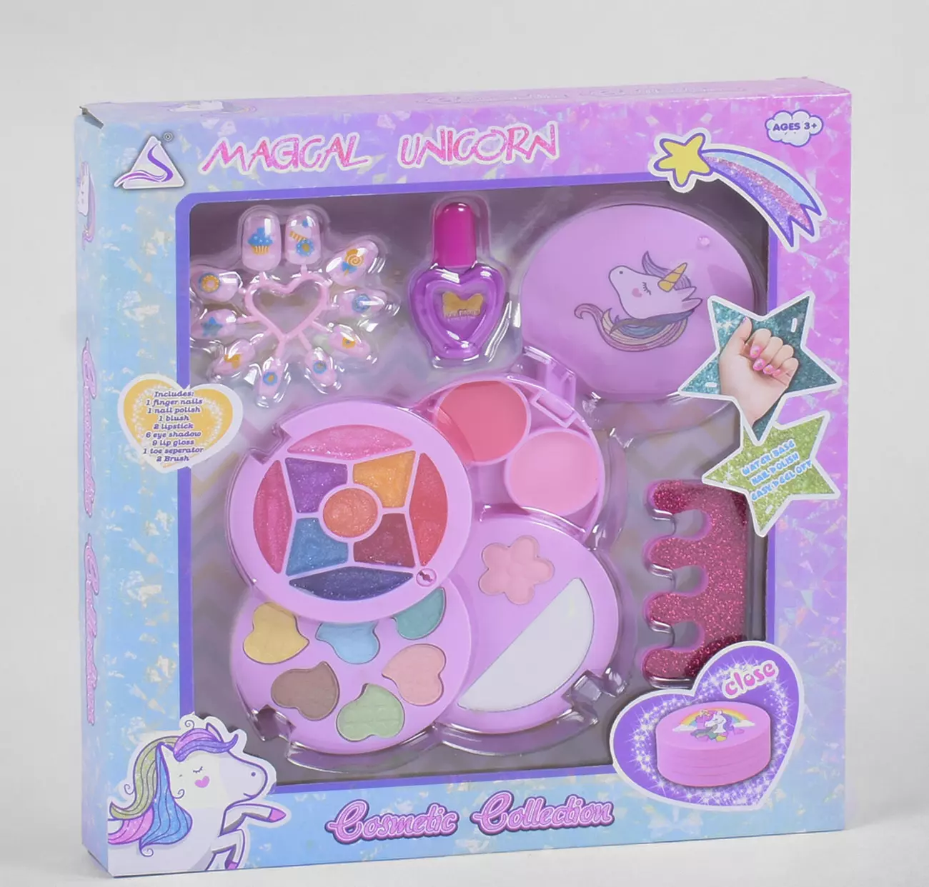 Чудова 4-х рівнева палетка в формі компактної шкатулки, стане прекрасним подарунком для будь-якої дівчинки, яка хоче експериментувати зі своєю зовнішністю з розумом і комфортом. Палітра виконана в привабливому рожевому стилі з зображенням милого єдинорога. 4 рівня - висувні і на кожному рівні розташовується певний тип косметики: 1 рівень - 9 блисків для губ: бордовий, червоний, малиновий, рожевий, фіолетовий, синій, блакитний, жовтий і оранжевий. 2 рівень - тіні для очей: салатові, зелені, коричневі, блакитні, бежеві, жовті; 3 рівень - дзеркало і рум'яна; 4 рівень - рум'яна в 2х рожевих відтінках. Також в наборі Ви знайдете все для створення манікюру: подушечка роздільник, лак для нігтів і звичайно ж накладні нігті.
