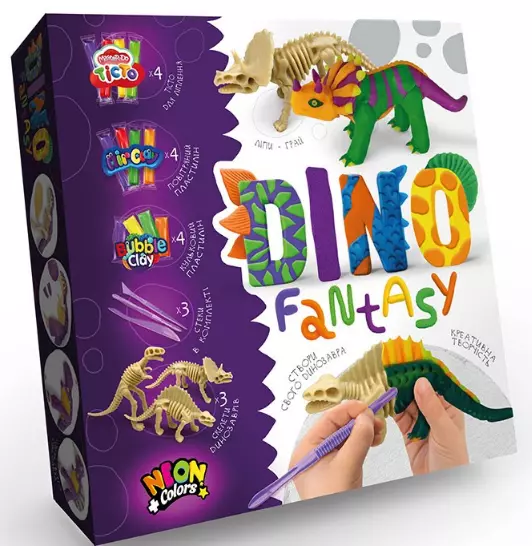 «Dino Fantasy» - створи свого унікального динозавра! Використовуючи всі матеріали з комплектації Ви зможете створити як вже відомих і раніше існували динозаврів, так і придумати абсолютно нових і ще не вивчених древніх рептилій. Комплектація: - тісто для ліплення - 4 шт .; - кульковий пластилін - 4 шт .; - повітряний пластилін - 4 шт .; - скелети динозаврів - 3 шт .; - пластиковий стек для ліплення - 3 шт .; - інструкція - 1 шт. Розміри упаковки (ДхШхВ) 185х185х40 мм