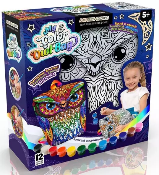 «MY COLOR BAG» - це УНІКАЛЬНИЙ набір креативного творчості, який сприяє розвиткові художніх здібностей, почуття кольору та гармонії у дітей і дорослих. Радуга яскравих відтінків в поєднанні з сяючим блиском, відкриє казковий світ творчості без кордонів і дозволить повною мірою розкрити Ваш талант! Візьміть фарби і РЮКЗАК з нанесеними контурами малюнка і просто розфарбуйте її як розмальовку! Малюнок виконаний в техніці ANTISTRESS, розфарбовуючи його, Ви не просто малюєте, а ще й відпочиваєте, розслабляючись і отримуючи задоволення від творчого процесу. Розфарбовувати РЮКЗАК можна як показано на упаковці, або на свій розсуд. Відчуйте себе дизайнером! Створіть оригінальні сумки з власним дизайном!