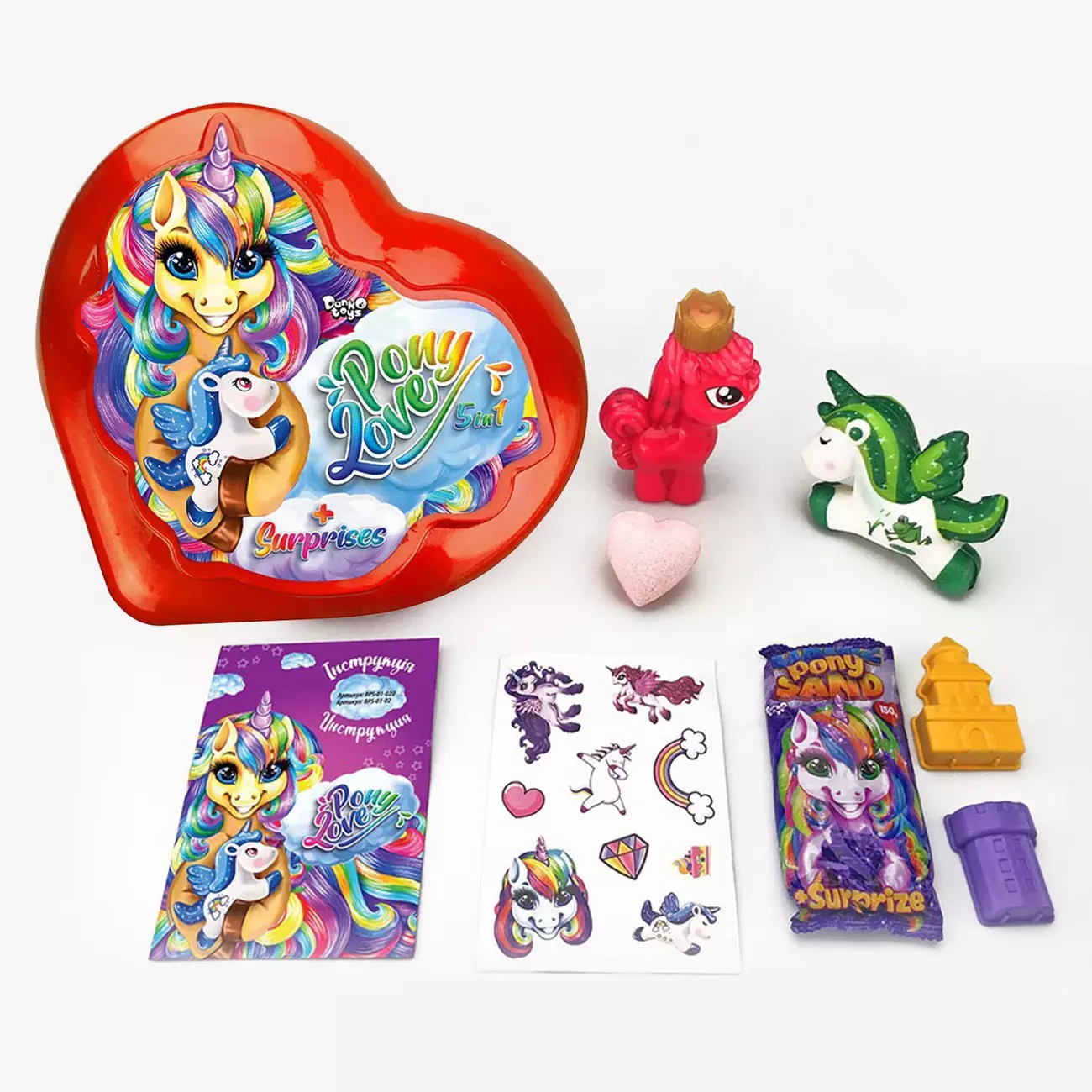 "Pony Love" - це неймовірне поєднання всього, що так подобається дітям. По-перше, яскраві сюрпризи та улюблені іграшки. А по-друге, захопливий інструмент для творчості та пізнання навколишнього світу. Завдяки «Pony Love» діти не просто розвиваються, а й роблять це з величезною цікавістю та задоволенням. - Squish Pony – 1 шт.; - Princess Pony слайм – 1 шт.; - Magic Pony пісок – 1 шт.; - форми - 2 шт.; - бомбочка для ванної у формі серця – 1 шт.; - комплект кристалів для створення браслета – 1 шт.; - гумка для створення браслета – 1 шт.; - комплект стікерів – 1 шт.; - інструкція – 1 шт.