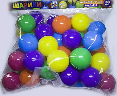 Кульки для сухого басейну, упаковка - п/е пакет із хедером. У комплекті 50 шт. Діаметр кулі – 7 см. Матеріал – пластик. Кольори в асортименті.