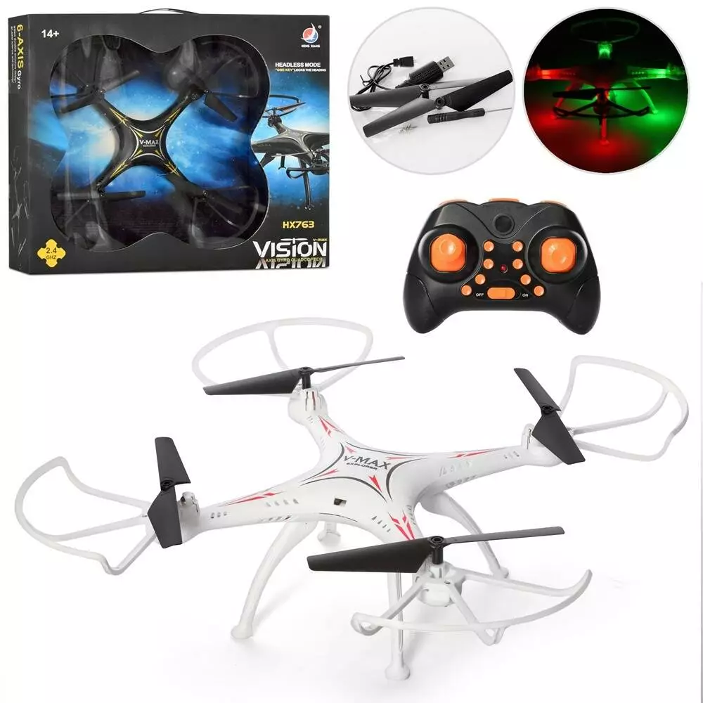 Квадрокоптер HX763 радіокер. 2,4G, акум., запас.лопасті, USB, 2 кольори, світло, кор., 48-41-6 см.