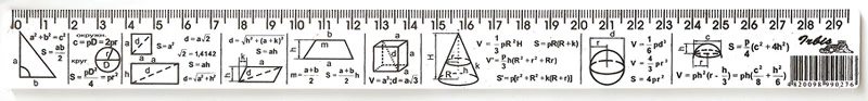 Лінійка пластикова 30 см з добре видимою розміткою (до 29,5 см). На лицьовій стороні також надруковані площі, довжини, маси і об'єму та інші тригеометричні фігури і формули.