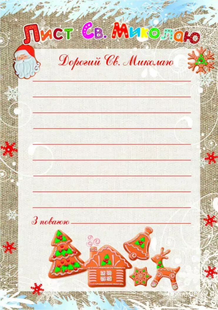 Завдяки цим чарівним новорічним бланкам діти зможуть написати листа Св. Миколаю. Дитинство - золота пора, коли віра в чудеса настільки сильна, що, здається, ніби казкові герої живуть поруч з нами. А День Св. Миколая для всіх діточок - чарівний час, коли можна розповісти доброму дідусеві свої маленькі секрети або просто попросити бажаний подарунок під подушку. Запропонуйте дитині написати лист Св. Миколаю на чарівному новорічному аркуші. Нехай малюк помріє, що хоче отримати в подарунок, про що може розповісти Св. Миколаю, чим похвалитися. Чудовий настрій гарантовано! Звичайно Св. Миколаю навряд чи сподобається, якщо дитина почне свій лист з прохань про подарунки. Пропонуємо в новорічному листі дотримуватися таких розділів: - Вітання (Добрий день, дорогий Св. Миколай, Шановний Св. Миколай...) - Трохи інформації про дитину з зазначенням імені та прізвища, віку ... - Короткий опис своїх досягнень за минулий рік. - Можна трішки написати про свої плани на наступний рік. - Ввічливе прохання про бажаний подарунок (бажано, щоб подарунків було декілька, щоб Св. Миколай міг вибрати) На закінчення потрібно обов'язково подякувати доброго дідуся і попрощатися до наступного року.
