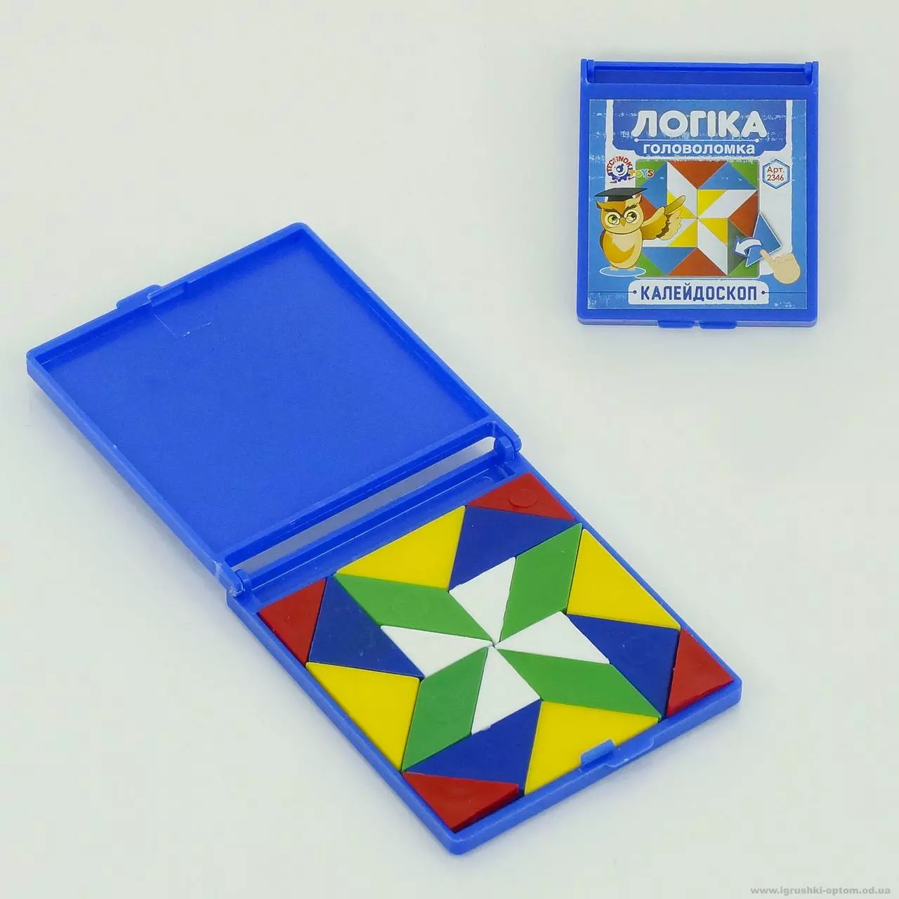 Матеріал: пластмаса. Іграшка поставляється в коробочці. Довжина: 7 см Висота: 8 см Товщина: 1 см Комплектація 20 геометричних фігурок. Настільна гра – головоломка «Калейдоскоп» для розвитку в дітей кмітливості, мислення, логіки та дрібної моторики. 20 різнокольорових геометричних фігурок, які треба так зібрати, щоб вийшов невеликий квадратик. Гра поставляється в спеціальній коробочці, яку завжди можна покласти в кишеню. Розгадувати головоломки краще всього на рівній поверхні, так як гра складається з дрібних деталей. Збирати головоломку можна по зображенню, яке є на коробці.