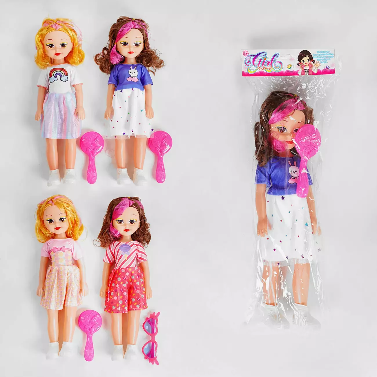 Нова лялька - те, що потрібно, аби викликати на обличчі дівчинки щасливі емоції. Симпатична лялькова красуня стане частиною цікавого лялькового життя, яке вирує у кімнаті кожної мрійниці. Кучеряве волосся іграшки прикрашене акцентними рожевими пасмами, які гармонійно поєднуються з вишуканою сукенкою лялечки. Особливості: - висота ляльки - 39 см; - ляльки представлені з двома видами аксесуарів: окулярами або гребінцем для волосся; - знімні черевички; - шовковисте волосся з яскравими акцентними пасмами; - одягнена у милу сукенку з візерунком; - рухливі ручки та ніжки.