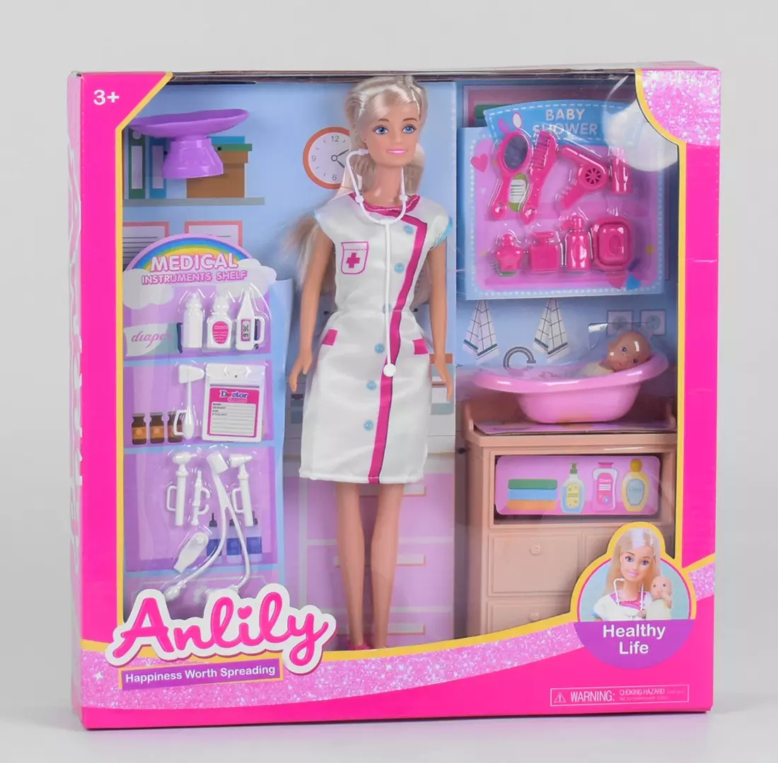 Чарівна лялька-лікар зі стетоскопом, готова допомогти кожному! Її ніжна посмішка допоможе швидше одужати будь-якому пацієнтові. У наборі Ви знайдете лікаря педіатра, який робить повне обстеження немовляти. У ляльки рухливі руки та ноги, вона одягнена в медичний одяг. Ваша дочка зможе придумати десятки рольових сюжетів, адже набір містить безліч медичних інструментів і аксесуарів. У комплект входить: - лялька-лікар; - немовля; - обладнання для кабінету; - ванночка; - медичні інструменти та аксесуари. Тематичні ігрові набори розвивають у дітей певні соціальні навички та знайомлять з новими професіями.