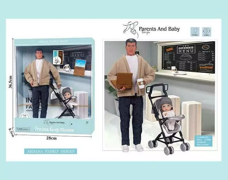 Лялька A 787-1 (24/2) тато з донечкою, візочок, ноутбук, чашка, висота 30 см, в коробці