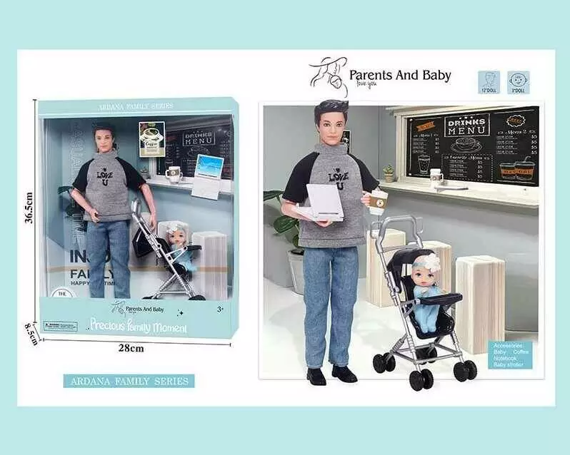Лялька A 787-3 (24/2) тато з донечкою, візочок, ноутбук, чашка, висота 30 см, в коробці