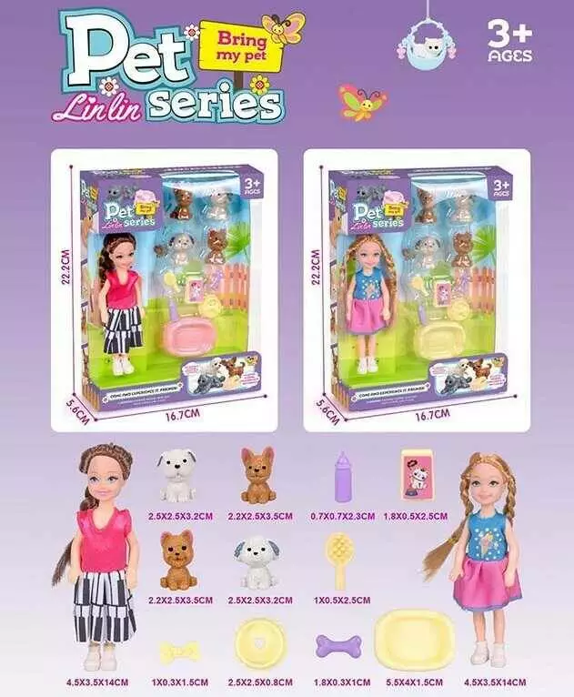 Лялька L 5-8 (144/2) 2 види, висота 14 см, 2 песика, лежанка, миска, кісточка, імітація засобів для догляду, в коробці