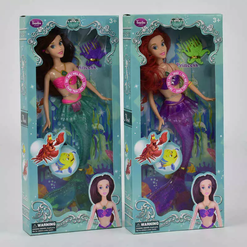Розмір: 7 см ? 5 см ? 30 см Розмір упаковки: 16 см ? 4 см ? 36 см Мультфільм про Русалоньку вже став класикою, але інтерес до неї, як до персонажа не згасає! Представляємо вашій увазі лялечку-русалку Аріель і її подружку. Кожна лялечка з довгим яскравим гумовим хвостиком і шикарним волоссям відтворює пісеньку Русалоньки англійською мовою. Варто тільки натиснути на намисто, і русалочка вам заспіває, а її хвіст сяятиме різнокольоровими вогниками. Працює лялечка від батарейок, якими кожна з них укомплектована.
