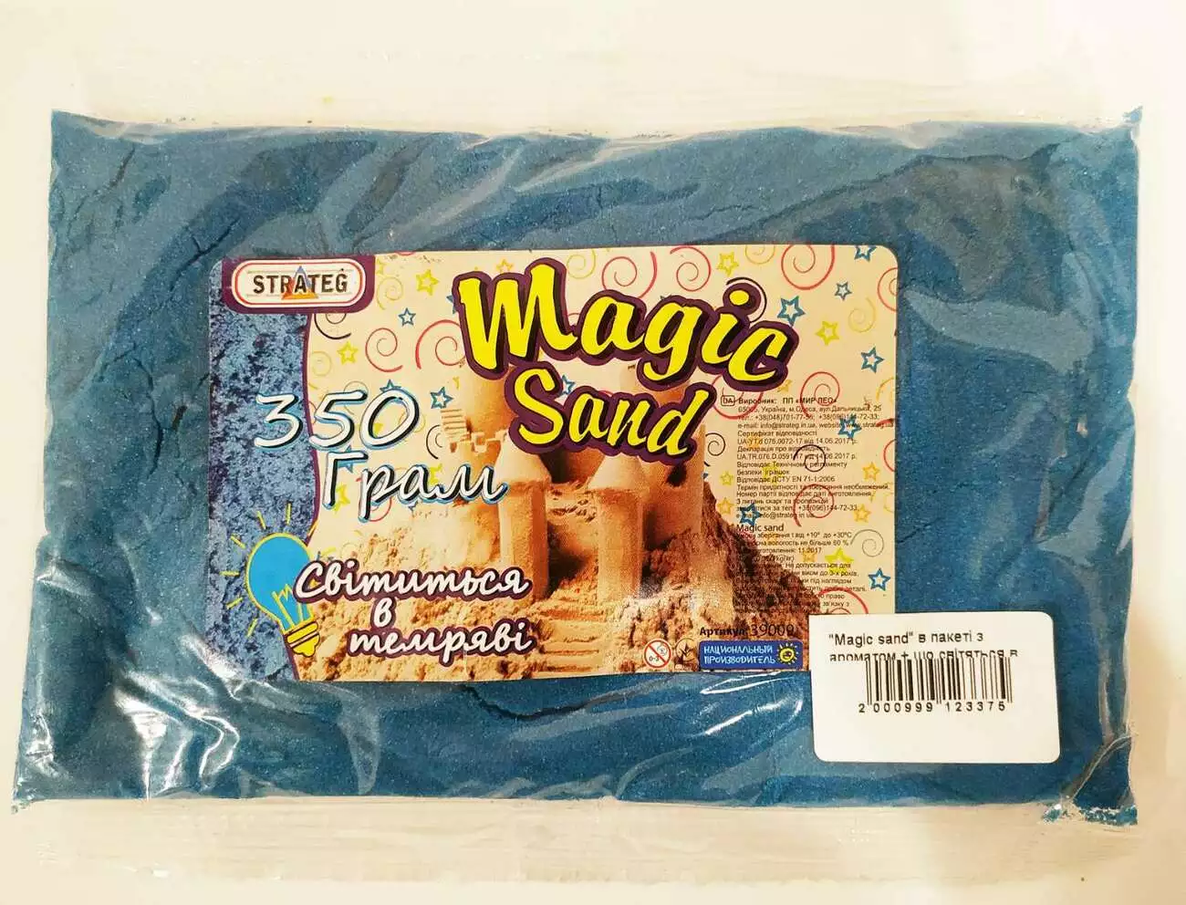 «Magic sand»- цей кінетичний пісок з ароматом, світиться в темряві і представлений в блакитному кольорі. Він, безсумнівно, сподобається малюкам і захопить в світ творчості. З такої речовини можна створювати дивовижні фігури: замки і будинки, тварин і пташок, екзотичні фрукти і інші цікаві скульптури, які прийдуть на розум маленькому фантазеру. Використовувати пісок також рекомендують для активного і повноцінного розвитку малюка. В такому ігровому процесі активно задіяні розумові процеси, дрібна моторика, образне і абстрактне мислення. Діткам дуже подобається грати з кінетичним піском, адже це дивовижне речовина не обмежує фантазію дитини. Висока якість кінетичного піску дозволяє використовувати даний матеріал багато разів без втрати його первинних властивостей. Пісок не липне до ручок, не залишає плям на робочій поверхні і одязі дитини, не висихає, відмінно тримає форму і безпечний для дітей.