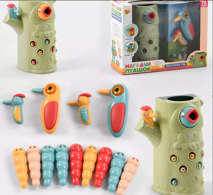 Захоплююча дитяча магнітна гра "Нагодуй пташок" від відомого виробника "TK Union Group" представлена в стильному та сучасному дизайні, який поєднує в собі ніжну палітру пастельних кольорів і приємні на дотик деталі. Дерево в якому сидить пташка забарвлене в приємний салатовий колір, кора з абстрактними закрученими лініями розстелилася по всій основі та доповнює оригінальний зовнішній вигляд. У стовбурі масивного дерева живуть 9 довгих черв'ячків. Їх тіло поділено на сегменти та пофарбовано в пастельний однотонний колір, а на голові розташувався магнітик та круглі очі. Турботливій мамі - пташці необхідно витягнути черв'ячка за допомогою спеціального магнітика на дзьобі та нагодувати свого голодного малюка. У неї рухливий дзьобик, який опускається і підіймається, при цьому відтворюється спів птахів, а також кнопка на крильці, яка активує: - підсвічування очей; - веселу мелодію. Маленький дятел в комплекті, також обладнаний магнітним клювиком, у нього приємна обтічна форма і гумовий чубчик. З даними розвиваючим набором дитина розвине координацію рухів, дрібну моторику ручок потренується уважність і посидючість. Всі ігрові елементи виконані з первинного пластику і пофарбована високоякісними фарбами, які абсолютно безпечні для малюків. Комплектація: - стовбур дерева; - 2 пташки; - 9 черв'ячків. Звукові та світлові ефекти пташки працюють від батарейок які входять в комплект.