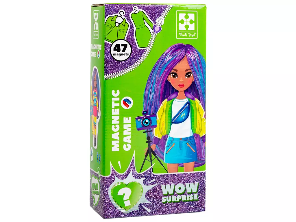 Магнітна гра-одяга серії "Wow Surprize". У наборі є магніт із дівчинкою та 47 магнітів із різноманітним одягом для неї. Одяг легко кріпиться та знімається. Також у наборі є подарунок-сюрприз для дитини. Виконано з якісних та безпечних матеріалів, виготовлено в Україні.